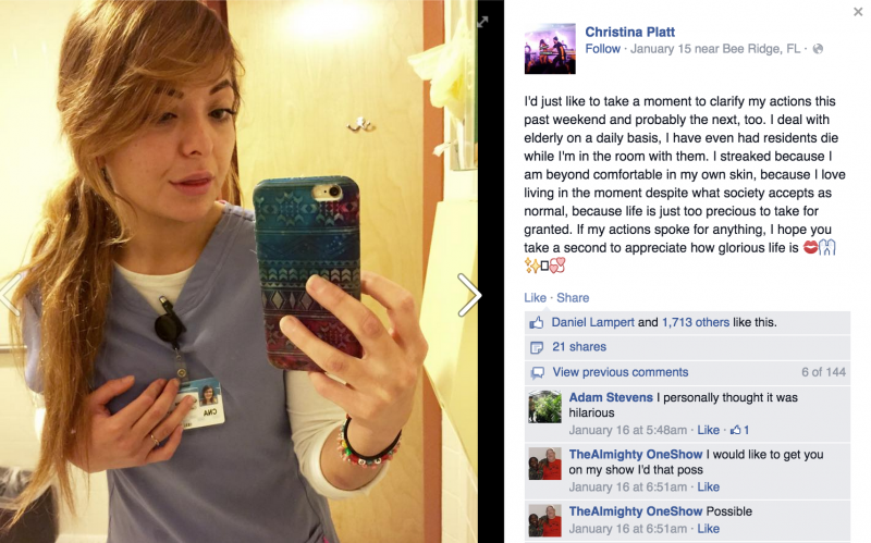 "Me gustaría tomar un momento para aclarar mis acciones durante el fin de semana pasado y probablemente el siguiente. Yo brego diariamente con personas mayores, incluso he estado presente con ellos en la habitación cuando mueren. Yo me siento más que cómoda en mi propia piel, porque me encanta vivir en el momento a pesar de lo que la sociedad acepta como normal, porque la vida es demasiado preciosa para dar por sentado. Si mis acciones no sirvieron de nada, espero que usted toma un segundo para apreciar cuán glorioso es la vida".